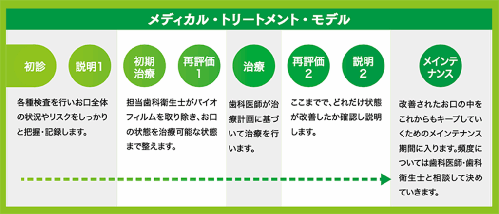 予防歯科を軸に治療を進めていく場合に、メディカル・トリートメント・モデルとされる治療の流れがあります。これは、初診・検査ののちに初期治療とよばれる歯科衛生士による指導・口腔衛生処置が行われ、再評価1の後に歯科医師による具体的な治療が進んでいき、最終的にはメンテナンスで健康維持を提供する流れです。ただし、初期治療中にプラークリテンションファクターの除去や急性症状の除去を必要とする場合もあります。この早期治療介入について、修復・歯内の観点から約2時間講演いたしました。